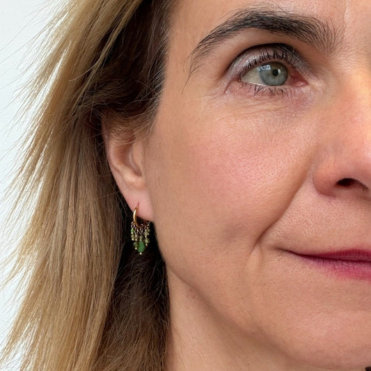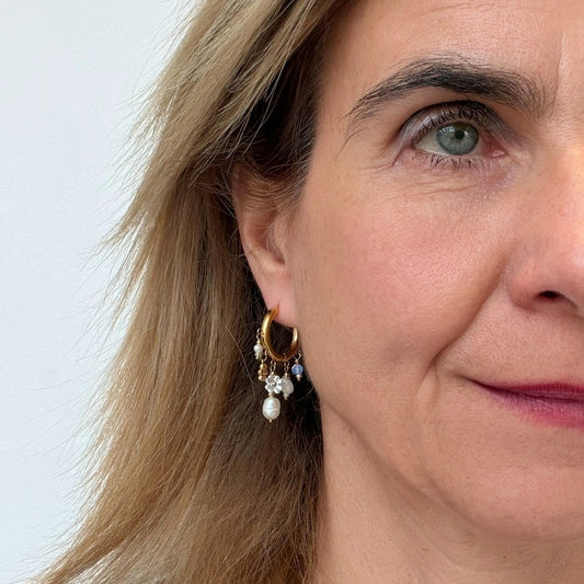 These beautiful hoop earrings have amazing colourful semi-precious gemstone charms.