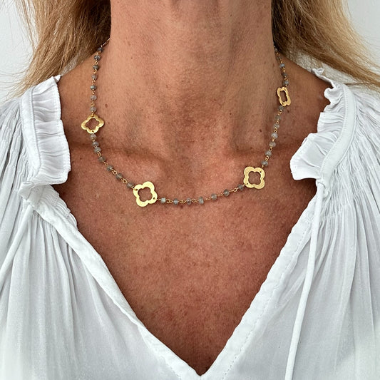 Rosary Labradorite Necklace with Small Gold Clover Charms