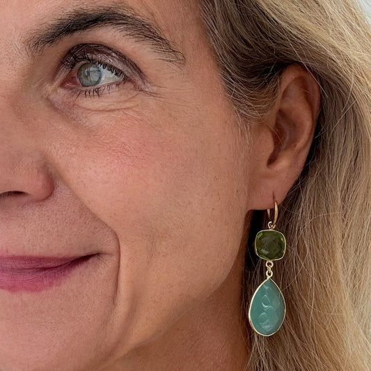 Gold Hoops with Peridot & Aqua Hydro Quartz Charms