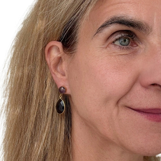 Dangling Gold Earrings with Amethyst, Pink Quartz and Turquoise