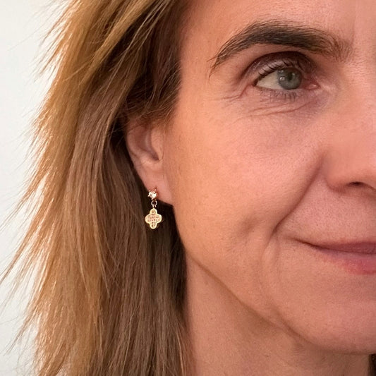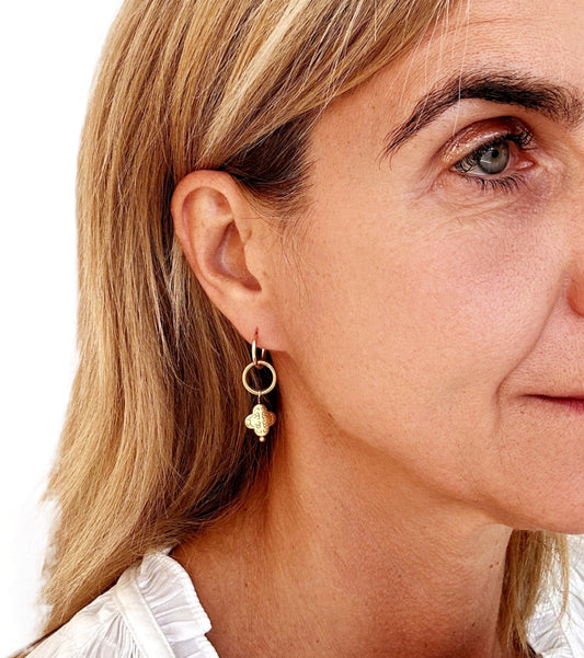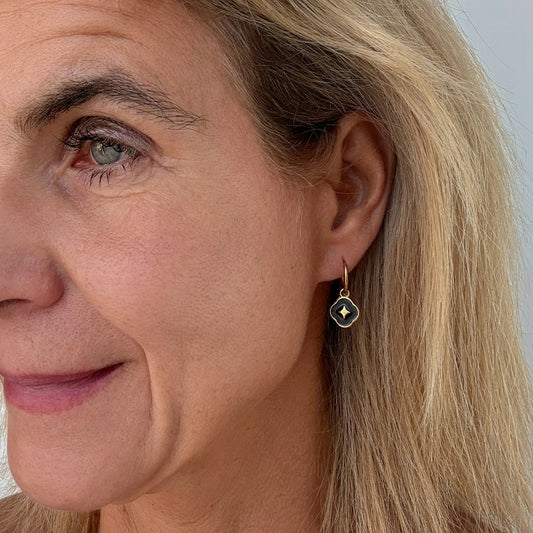 Earrings with clover shaped charms in 3 styles: simple gold hoops, huggie rainbow hoops, and larger rainbow hoops. The charms are made of faceted glass, gold or natural stone.
