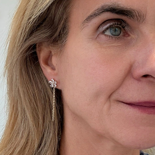 Sparkly Gold Flower Studs with Dangling Chain