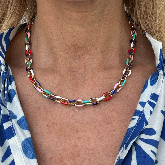 Paperclip Necklace with Rainbow Beads & Gold Discs