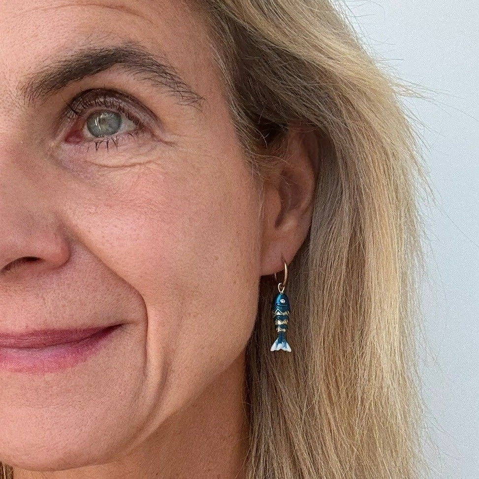 Delicate gold hoop earrings with blue moving fish charms. The hoop diameter is 13mm and charm size is 27mm with total drop of 40mm. Gold plated stainless steel which is nickel free and hypoallergenic.