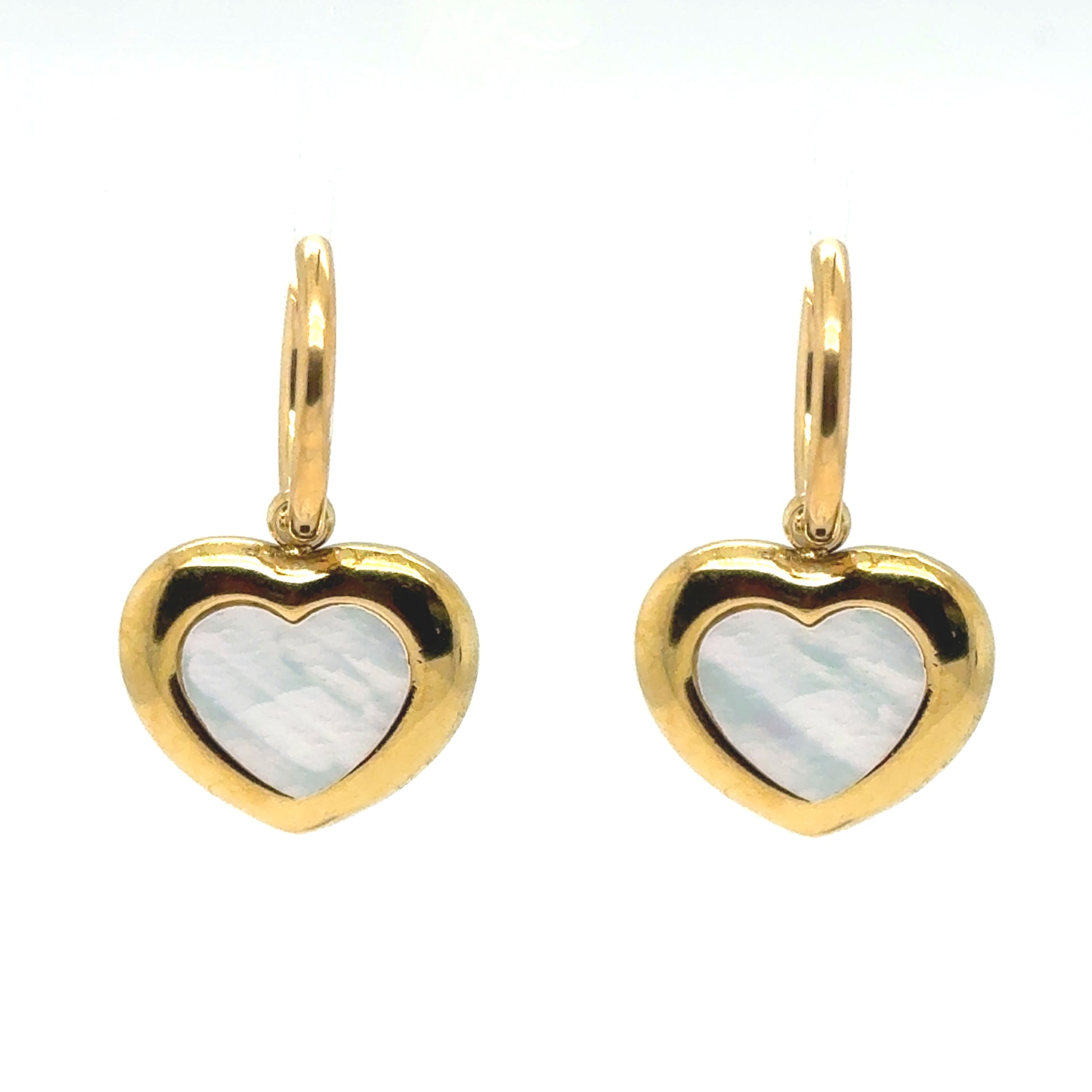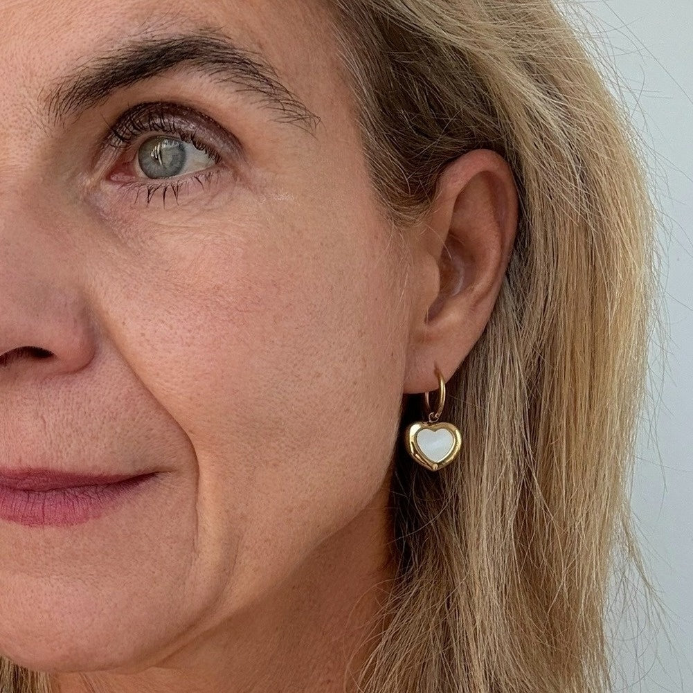 Delicate gold hoop earrings with heart shaped mother of pearl and gold charms.