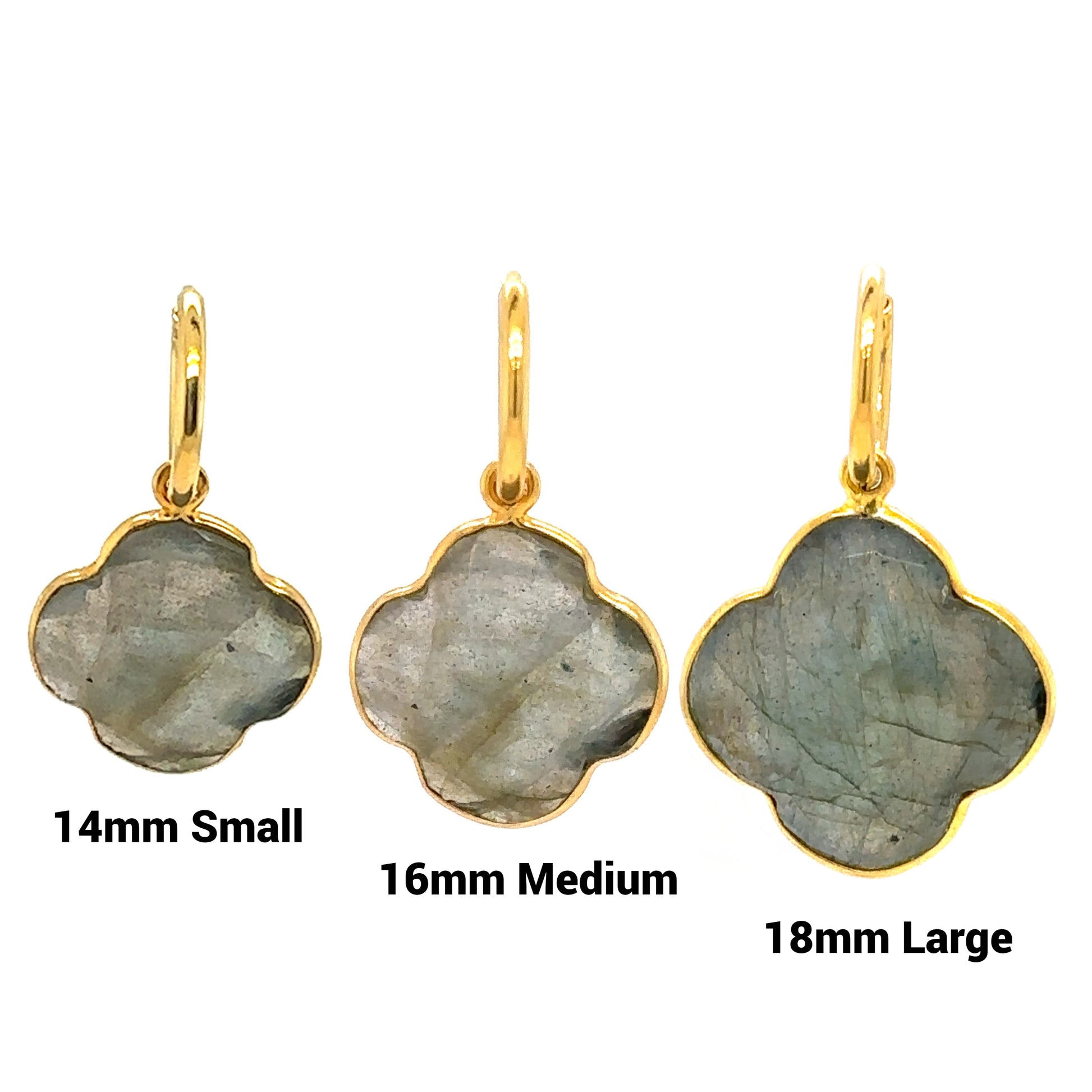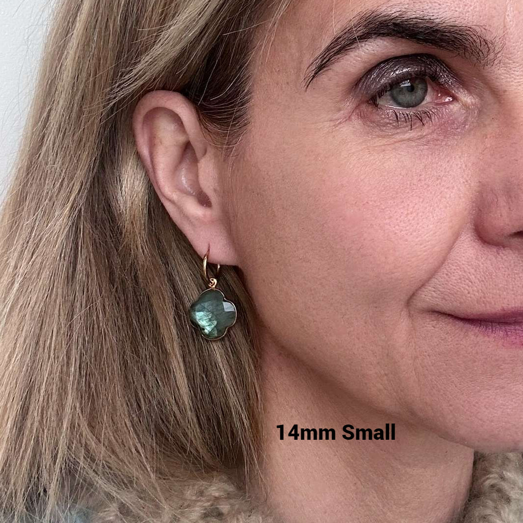Delicate gold hoop earrings with iridescent Labradorite semi-precious gemstone clover shaped charms.