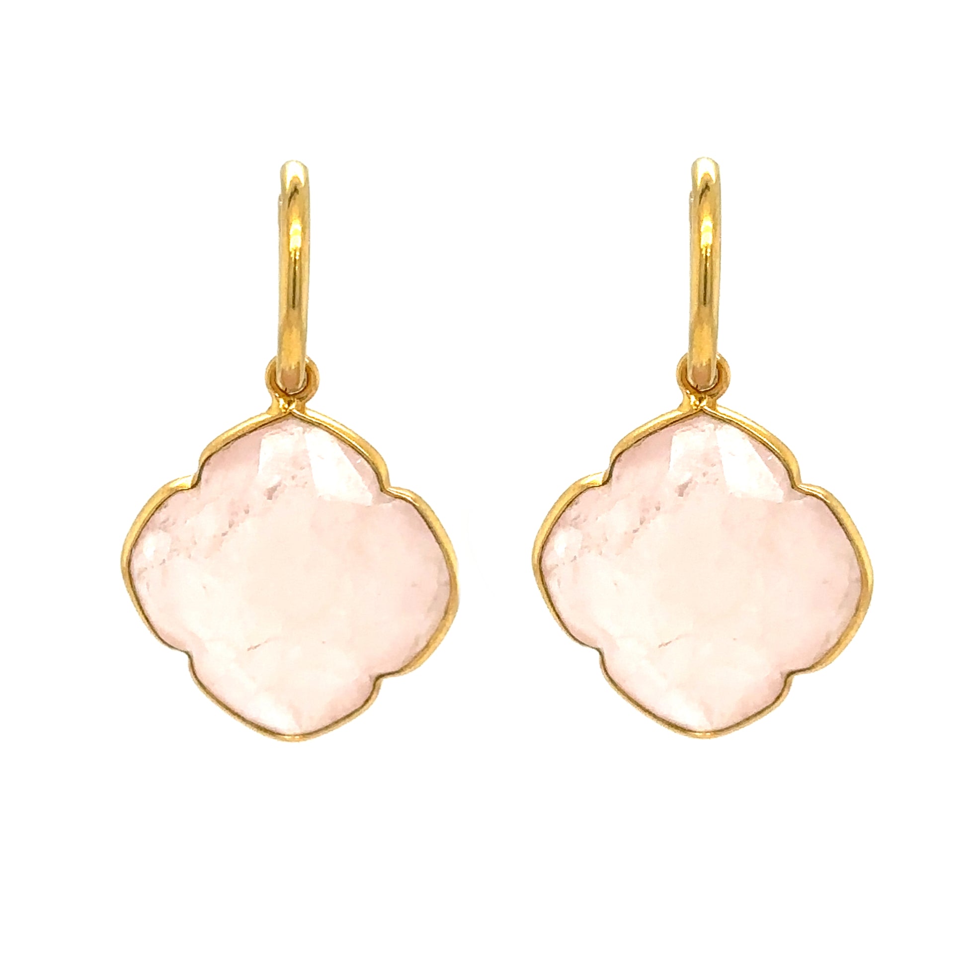Delicate gold hoop earrings with beautiful Rose Quartz semi-precious gemstone clover shaped charms.
