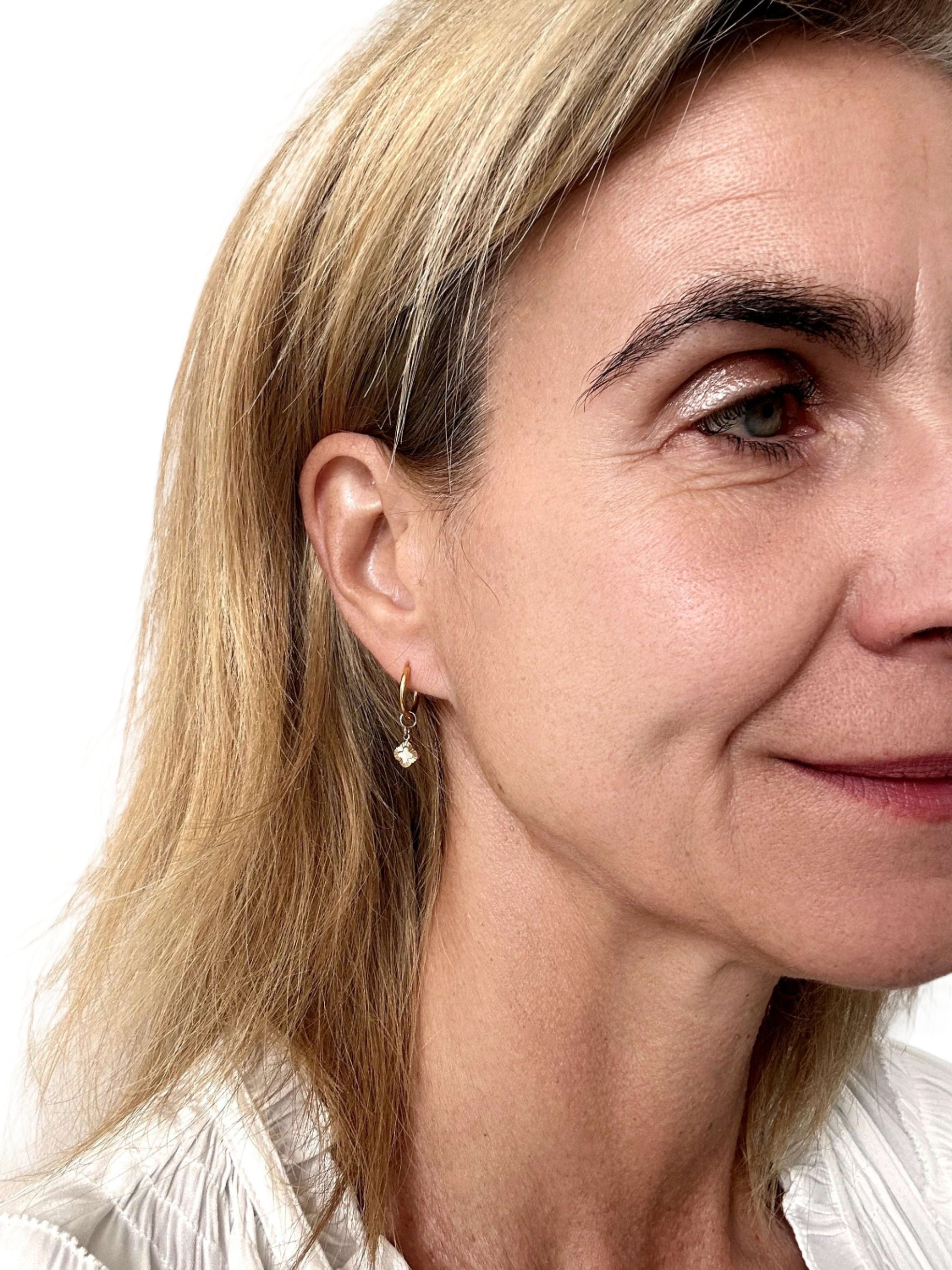 Delicate gold hoop earrings with small clover shaped mother of pearl charm.