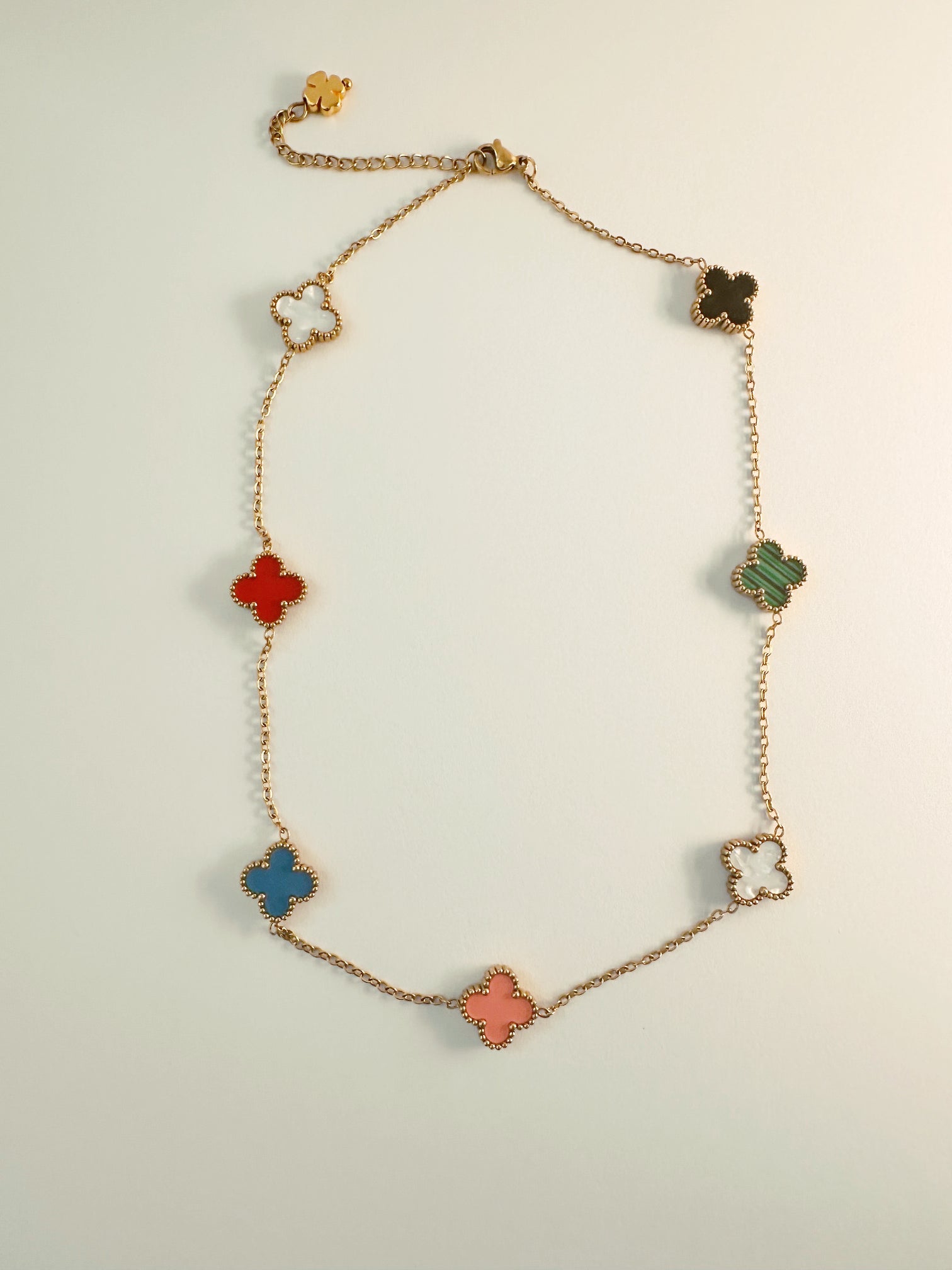 Necklace with Seven Small Clover Charms in Rainbow Colours
